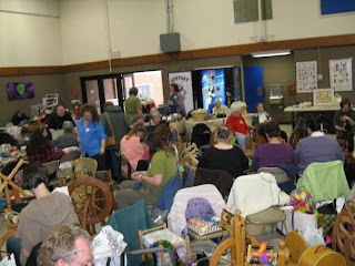 Saturday we were up bright and early and enjoyed some coffee cake that Shelia brought for us to enjoy. We then drove the half an hour further south to the spin-in at the Newport High School. We arrived early so that we were assured of parking and so we could pick out our seats. ;-) Robyn, we spin with her on Wednesdays, was there selling some of her handknits/crochet items along with a friend of hers that does handdyed fiber. Stitchjones, aka Sharon, was also there, so lots of familiar faces for us.